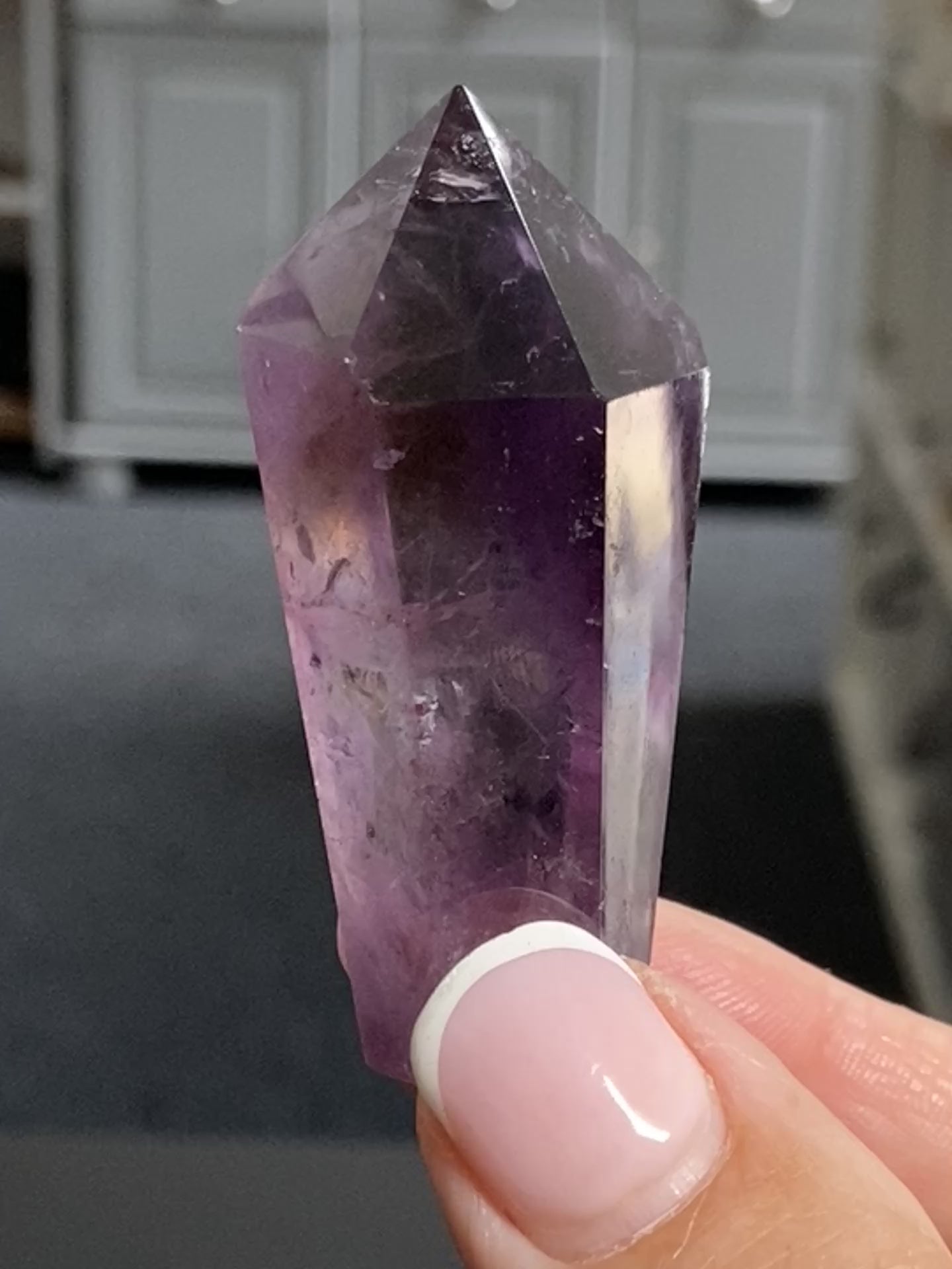 Smoky Amethyst Phantom – A natural mix of Amethyst and Smoky Quartz, sometimes occurring in distinct layers, sometimes as a soft gradient. The internal phantoms, often stacked in clear horizontal lines, are natural formations that record shifts in the crystal’s environment as it grew—offering symbolic support for layered healing, personal growth, and moving through transitions.