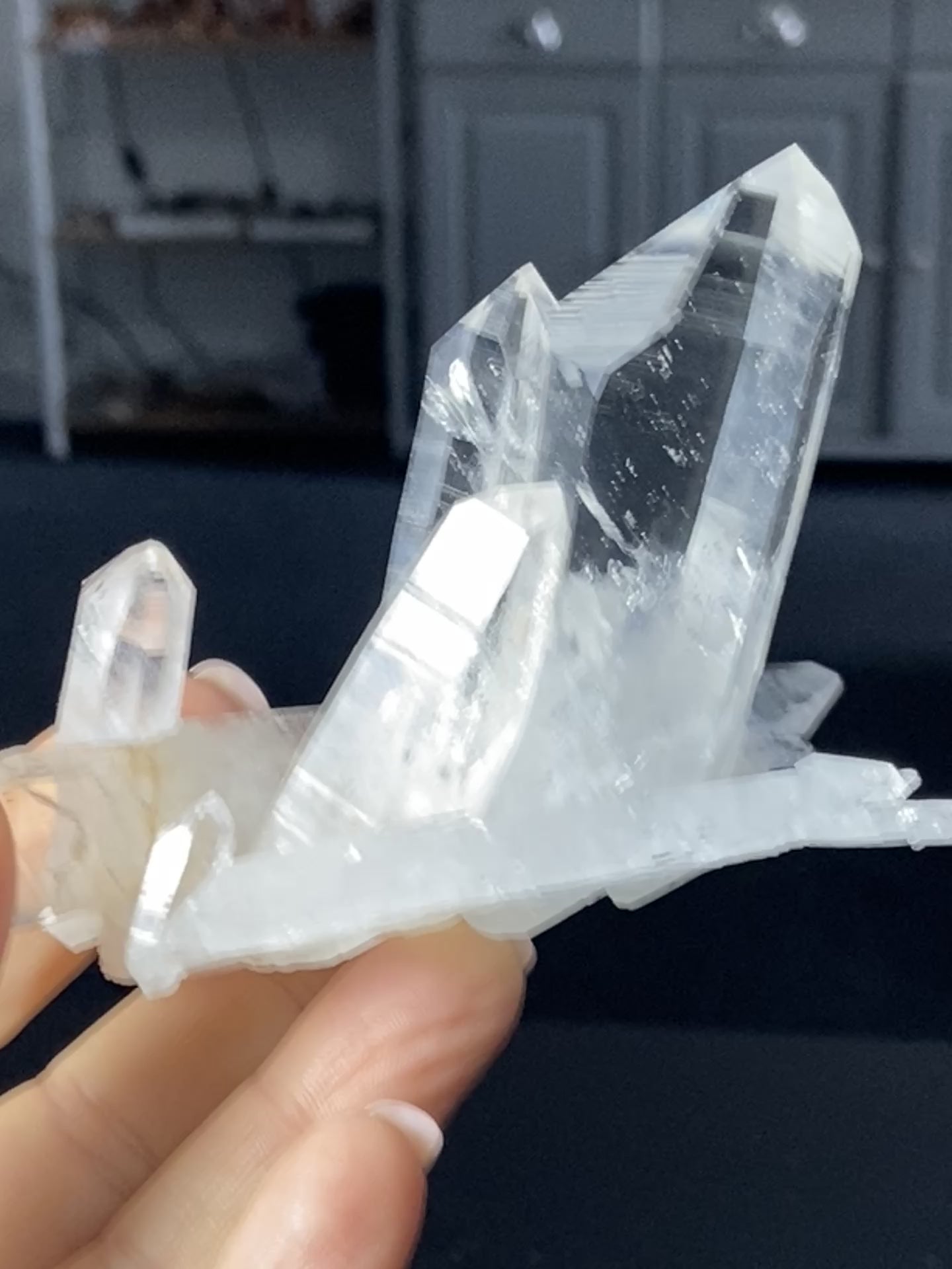 This Lemurian Light cluster holds an incredible intricate formation. A dominant upright point rises from the centre, surrounded by smaller crystals that radiate from the base, all interconnecting through the cluster. Two horizontal crystals run lengthways, pierced by vertical growths that extend through and beyond them. One ending in a beautiful multi-terminated tip.