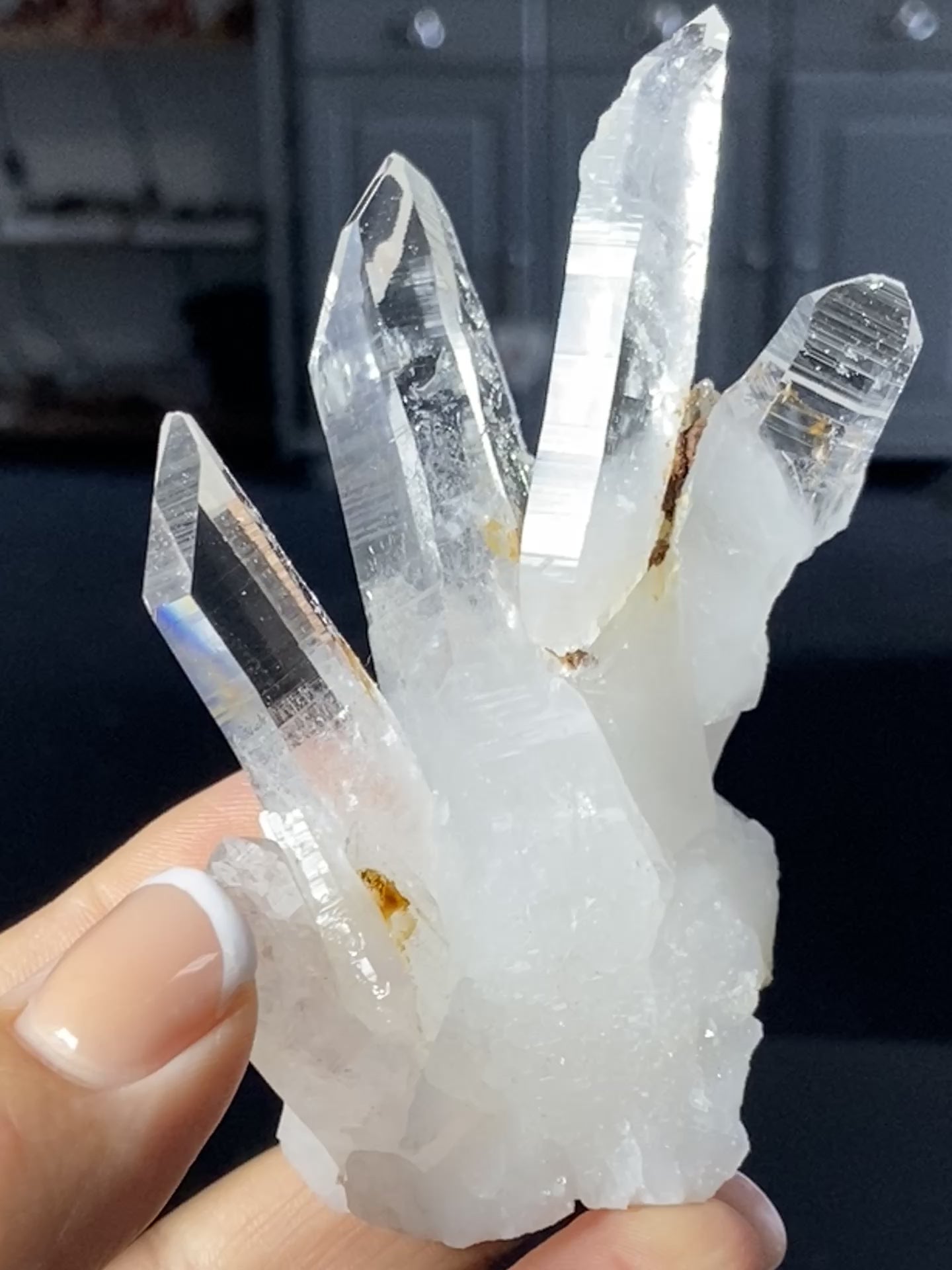 This Lemurian Light cluster features four beautifully formed main crystals, all rising together from a shared base. One of the points has partially detached, its back still anchored within the cluster. A sign of its natural growth and transformation. The clarity throughout is excellent, with soft golden limonite inclusions that add warmth and depth to the piece.