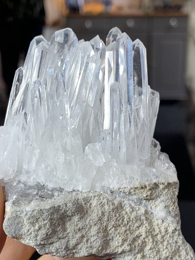 This beautiful Lemurian Light cluster features a dense grouping of fine, slender needle-like crystals rising from a natural base rock. Together they create the look of a crystalline forest.
