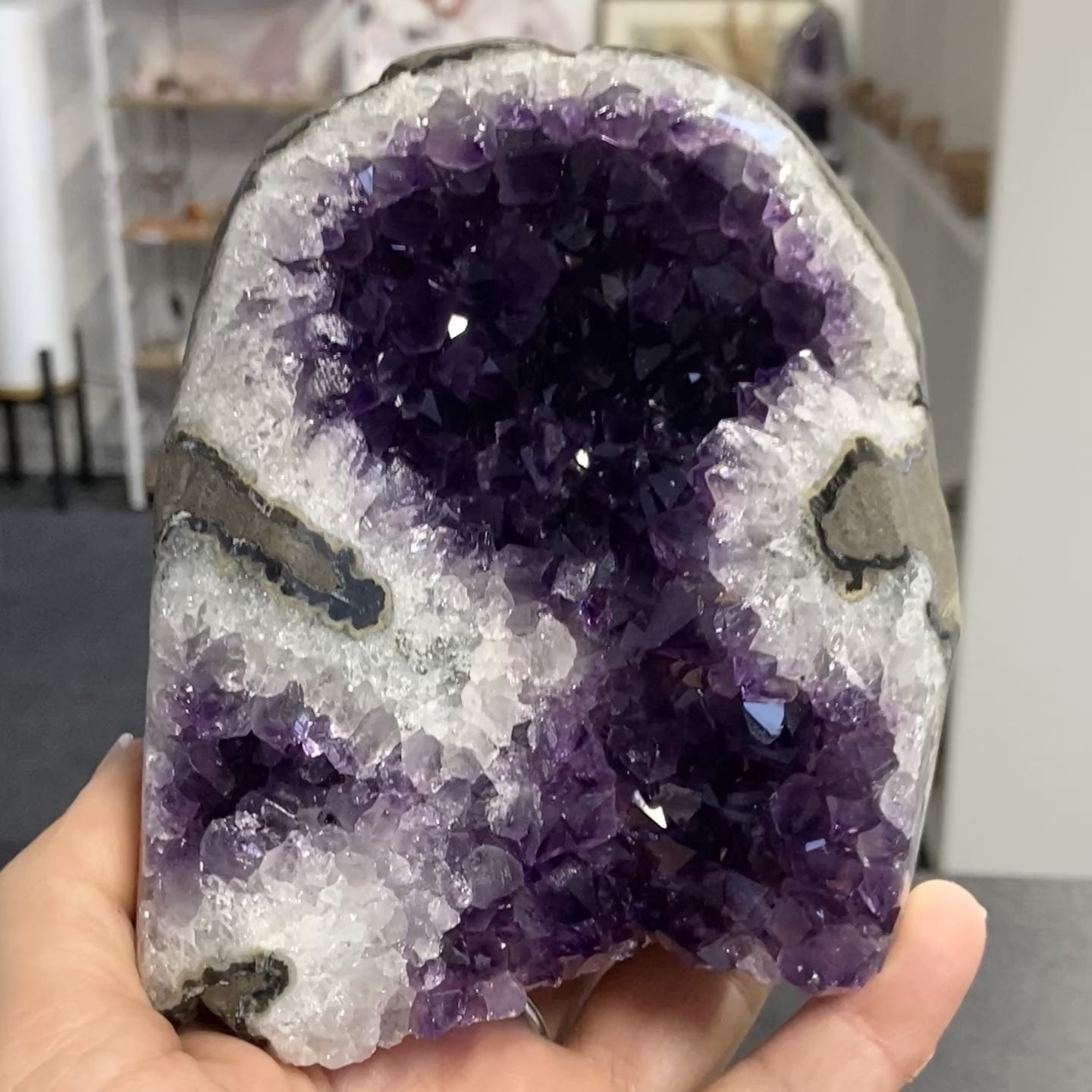 This is a high-quality Amethyst geode from Uruguay, weighing nearly 1.4 kilograms. Uruguayan Amethyst is highly prized for its exceptional, deeply saturated purple colouration. The crystal cavity is densely packed with small, vibrant, sparkling points, creating a spectacular visual effect. The outer shell features a thick, natural rim of grey/white Quartz, providing a beautiful contrast to the deep purple heart.