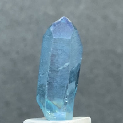 This began life as a Brazilian Starbrary Quartz, already full of character with its subtle markings and naturally etched surfaces. It has since been transformed into an Aqua Aura crystal through a high-grade bonding process carried out in Arkansas, where some of the world’s finest aura quartz is produced. Pure vapourised gold is fused to the Quartz at a molecular level, creating that unmistakable blue sheen with soft flashes of rainbow when the light moves across it. The underlying Starbrary geometry still comes through, giving it a layered, almost ancient feel beneath the modern iridescence.