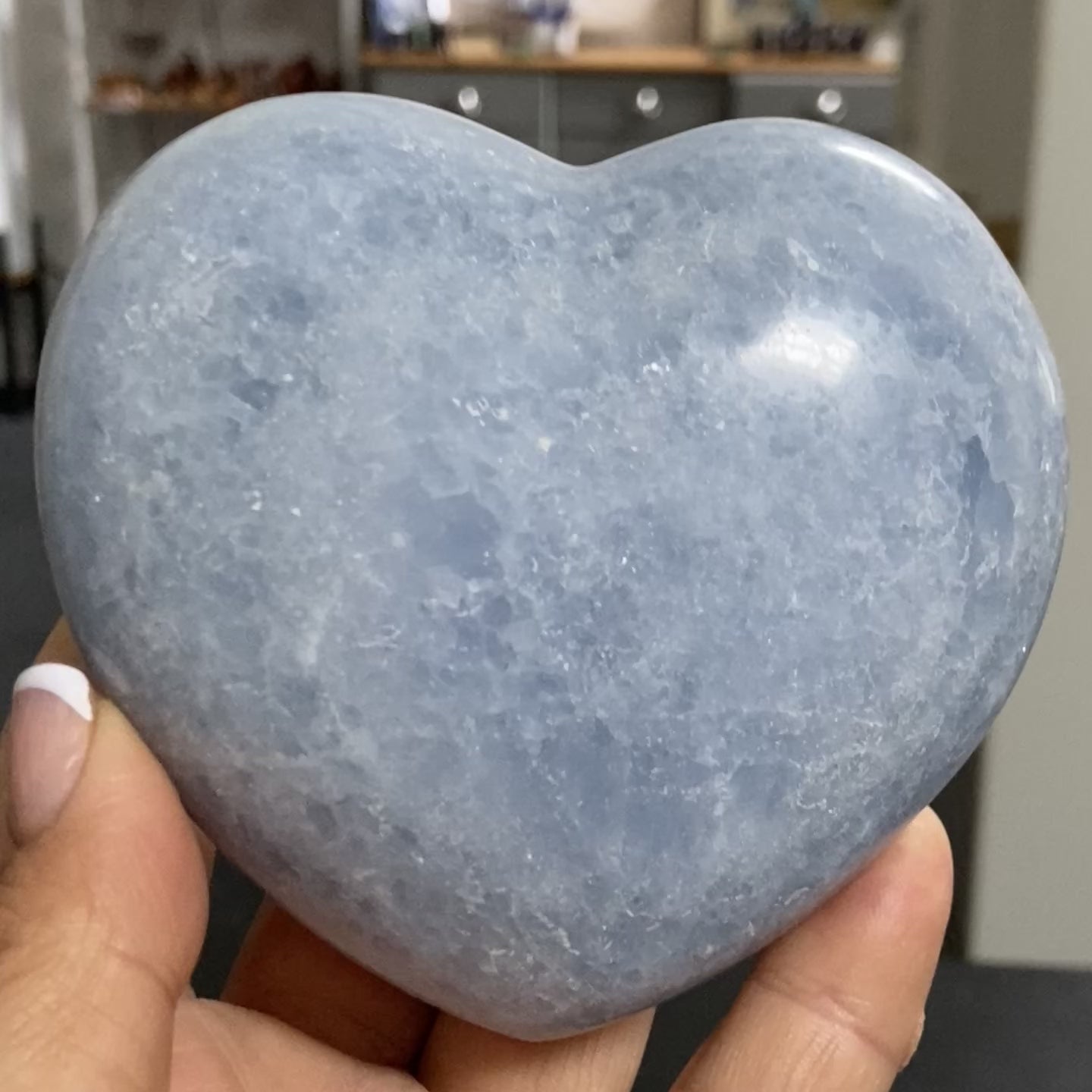 A large, beautifully polished Blue Calcite heart from Madagascar with soft clouds of colour. Madagascan Blue Calcite is renowned for its exceptional quality, far superior to the more common Moroccan variety, with a richer tone and clearer structure.
