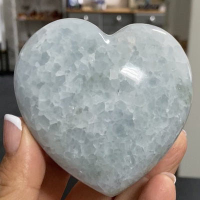 A soft and serene Blue Calcite heart from Madagascar with a delicate, almost Aquamarine-like tone. The colour is light and luminous, giving it a tranquil, oceanic feel. Madagascan Blue Calcite is well known for its superior quality compared to the more common Moroccan material, showing a finer grain and a natural internal shimmer.