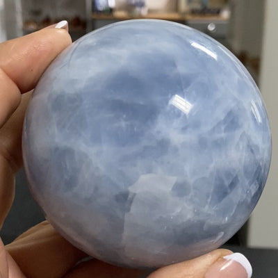 This sphere carries a calm and steady energy, perfect for creating a peaceful atmosphere in any space. The gentle blue hue encourages stillness and emotional clarity, helping to quiet the mind and ease tension. Perfect for the bedroom.
