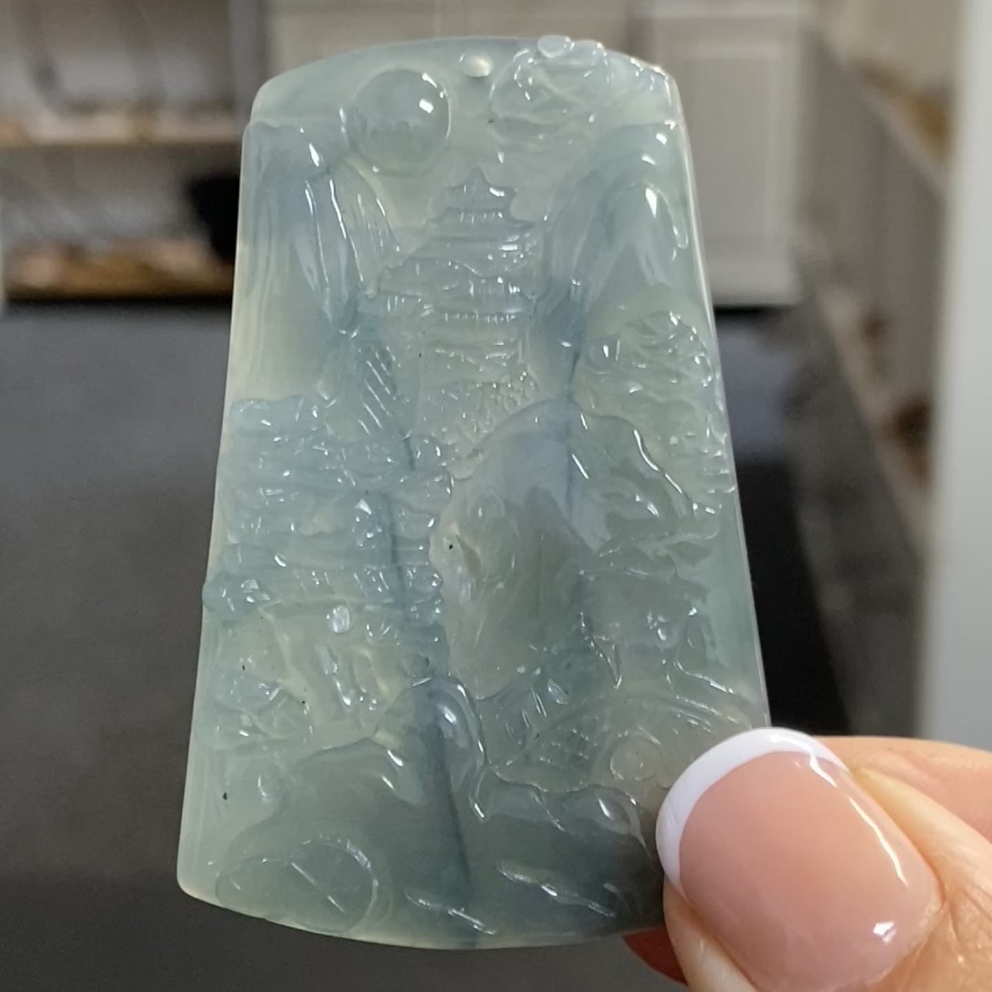 A beautifully detailed hand-carved Blue Jadeite landscape scene from Guatemala — a serene depiction of mountains, clouds, and temple motifs etched into genuine Jade. The piece has a small hole at the top, allowing it to be strung as a pendant or hung for display. It comes with a simple stand, perfect for showing off its natural translucence and soft, oceanic blue tone.