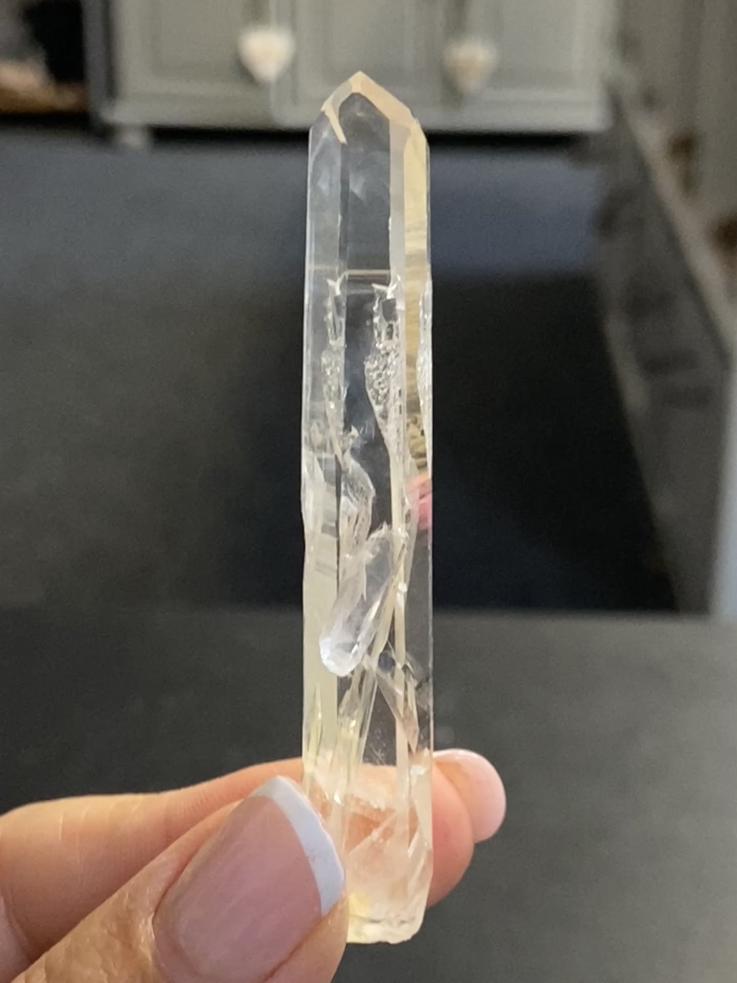 This Lemurian carries the rare blue smoke effect within its body, giving it a refined, high-frequency presence. At the base are very delicate golden healer vibrations, adding a bit of warmth and grounding to balance the crystal’s luminous energy. It also features a penetrating crystal intersecting the main body and a key release section — both signs of complexity and depth in its growth.