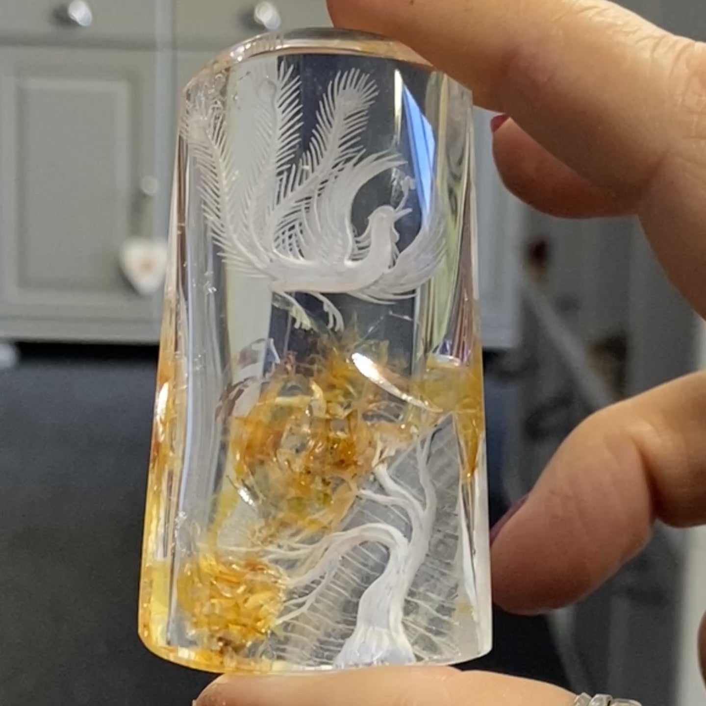 On the back, the Quartz has been diamond-etched by hand, a slow, highly skilled process that allows for extraordinary detail. Etched into the surface is a Phoenix rising beside a tree, a powerful and timeless symbol of rebirth, resilience, and renewal. Diamond etching is not decorative scratching. It requires precision, patience, and complete confidence in the material. One slip and the piece is lost. Work like this is done deliberately and with respect for the crystal.