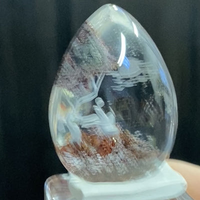 A serene and quietly powerful Clear Quartz carving featuring a meditating spirit being beneath a windswept tree. The artisan has etched the figure delicately into the back of the crystal using a diamond-tipped tool, following the natural shape of the internal landscape. The rich reddish and earthy inclusions form a natural forest floor, while the upper section holds soft veils and clarity that give the scene an otherworldly stillness.