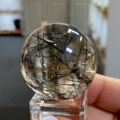 A striking Clear Quartz sphere filled with bold, thick rods of Black Tourmaline, creating dramatic contrast and depth. Subtle inclusions of Iron lend a warm golden glow that catches the light beautifully, making this piece both powerful and visually captivating.