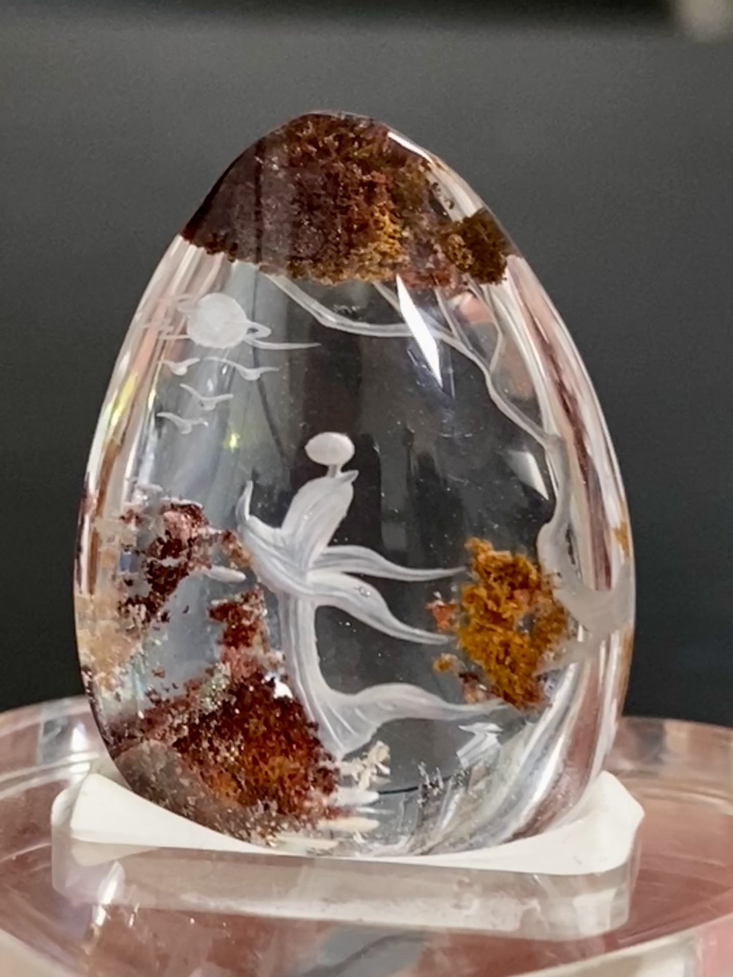 Formed into teardrops, ovals, spheres, and the occasional square, each one has a completely unique energy. The artisan has carefully etched images into the back of the crystal using a diamond-tip tool — dragons, phoenixes, meditating spirit beings, stairways to the higher realms, and sacred trees. The internal world of the crystal and the carved imagery blend together as if they were always meant to be.