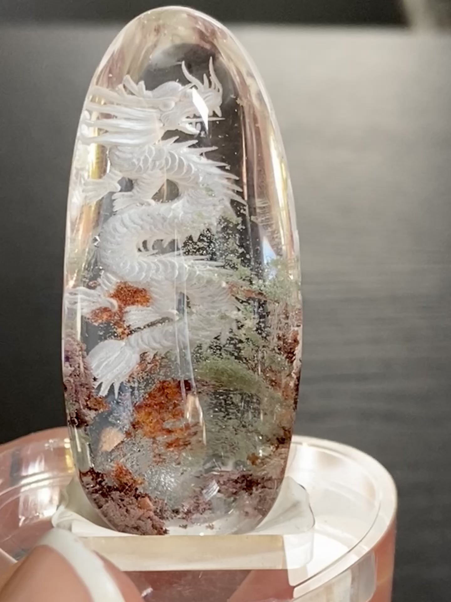 Formed into teardrops, ovals, spheres, and the occasional square, each one has a completely unique energy. The artisan has carefully etched images into the back of the crystal using a diamond-tip tool — dragons, phoenixes, meditating spirit beings, stairways to the higher realms, and sacred trees. The internal world of the crystal and the carved imagery blend together as if they were always meant to be.