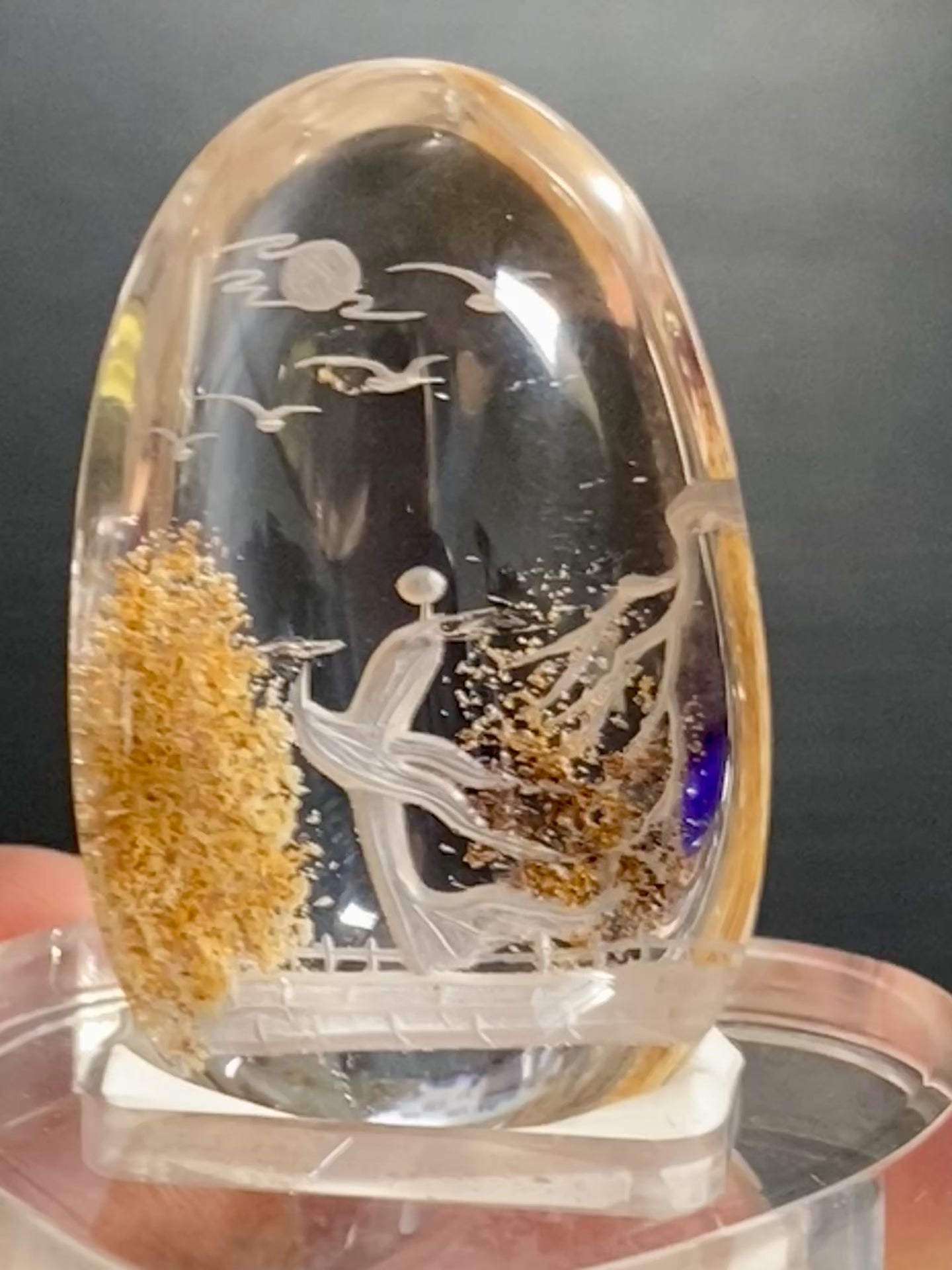 Formed into teardrops, ovals, spheres, and the occasional square, each one has a completely unique energy. The artisan has carefully etched images into the back of the crystal using a diamond-tip tool — dragons, phoenixes, meditating spirit beings, stairways to the higher realms, and sacred trees. The internal world of the crystal and the carved imagery blend together as if they were always meant to be.