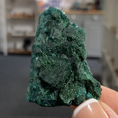 These Dioptase pieces from Morocco are little bursts of colour. The green is so vivid it almost glows, that deep emerald tone Dioptase is known for. The crystals sit on their natural matrix in bright, glassy clusters. Some pieces have sparkling pockets, others show larger, more defined crystals, but every one has that striking green that catches the eye straight away.