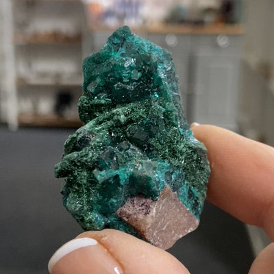 These Dioptase pieces from Morocco are little bursts of colour. The green is so vivid it almost glows, that deep emerald tone Dioptase is known for. The crystals sit on their natural matrix in bright, glassy clusters. Some pieces have sparkling pockets, others show larger, more defined crystals, but every one has that striking green that catches the eye straight away.