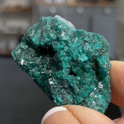 These Dioptase pieces from Morocco are little bursts of colour. The green is so vivid it almost glows, that deep emerald tone Dioptase is known for. The crystals sit on their natural matrix in bright, glassy clusters. Some pieces have sparkling pockets, others show larger, more defined crystals, but every one has that striking green that catches the eye straight away.
