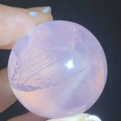 A beautiful, gemmy Star Rose Quartz sphere from Brazil with a lovely pink colouring and a soft internal glow. Luminous depth, super gemmy and translucent. When turned under direct light, you can see two fine six-rayed star asterisms, gliding gently across the surface.