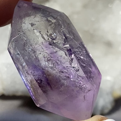 A stunning Brazilian Amethyst with a soft, pale body at one end that deepens into a more saturated lilac at the other. It holds at least two enhydros, both of a good size and that travel well. The colour gradient is beautiful.