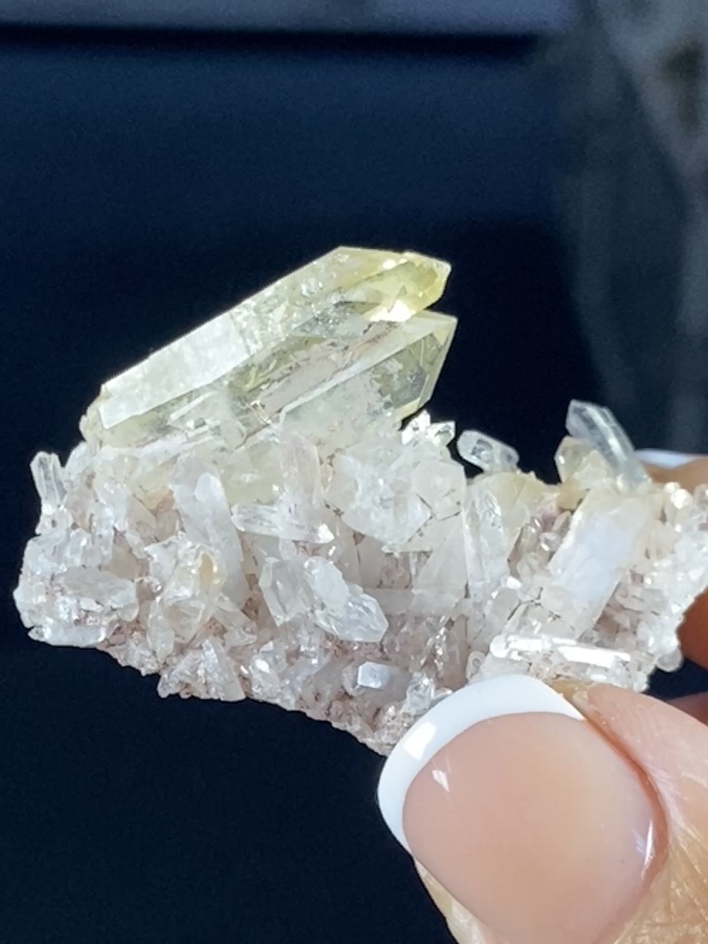 This small but powerful cluster comes from the Santander region of Colombia, part of the same discovery as the Sacred Pink Lemurians. Instead of the pink blush, this one carries a golden hue from iron oxide inclusions, blending with the rare faden formation seen clearly through its centre.