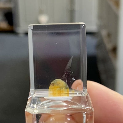 A beautiful, cabinet-worthy piece of flawless clear quartz with a delicate arch of golden iron inclusion near its base — perfectly resembling a sunrise emerging over a crystal horizon. The clarity of this quartz is exceptional, allowing the warm golden tones to appear suspended in light, creating a serene and uplifting presence.