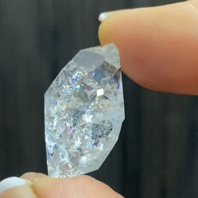 A bright little Herkimer Diamond with gorgeous internal sparkle, mined by my own hands back in 2019. It has that classic double-terminated shape, with crisp natural facets and a beautifully clear body that catches the light from every angle. Inside, tiny rainbows and internal details dance around, giving it a lively, sparkling presence.