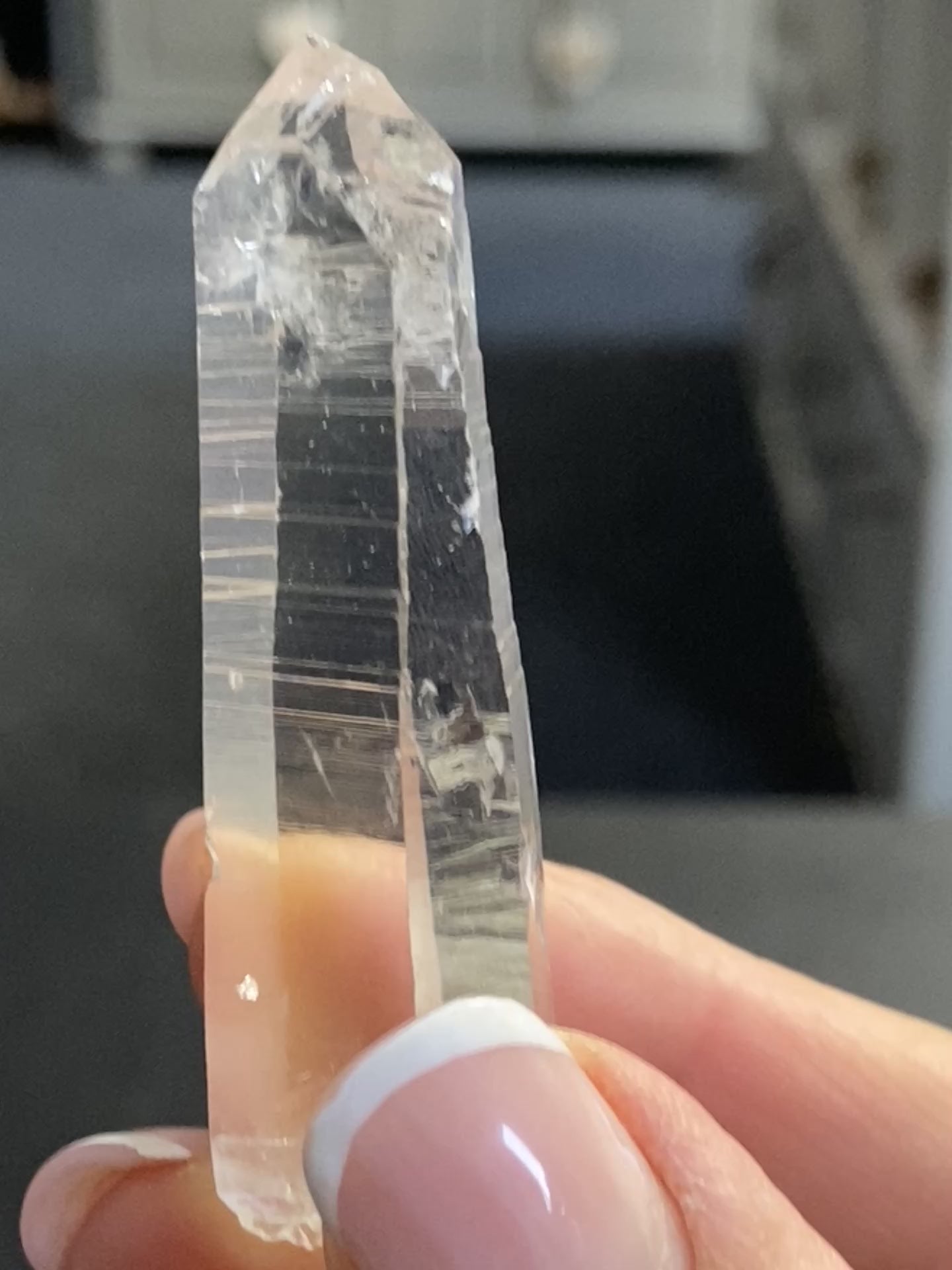 This Lemurian weighs 24g and measures 7cm. It isn’t in the Blade of Light formation, but it carries the unmistakable qualities of Peñas Blancas — clarity, lustre, and refinement. Its surface shows well-defined striations, easy to feel with the fingertips, making it a classic working Lemurian from this revered locality.