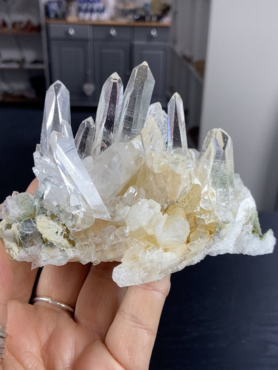 This Lemurian Light cluster is STUNNING. I have one very similar in my collections. Perfectly tapered points rising together in beautiful formation. The quartz carries exceptional clarity, and within the cluster are golden healer inclusions from limonite alongside soft green tones of fuchsite in the matrix, adding depth and character to the piece.
