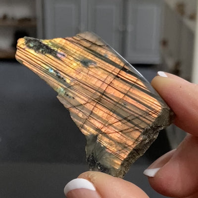 These Labradorite slices from Madagascar feel especially aligned with Year 1 energy – the year of beginnings, rebirth, and quiet but powerful turning points. Each piece holds exceptional colour. You will see flashes of blue, teal, green, gold, and in some pieces, vibrant orange, pinks, and purples. Polished on one side and left raw on the back. Some even show incredible colour on the rough side, as if the stone itself refuses to hide its magic.