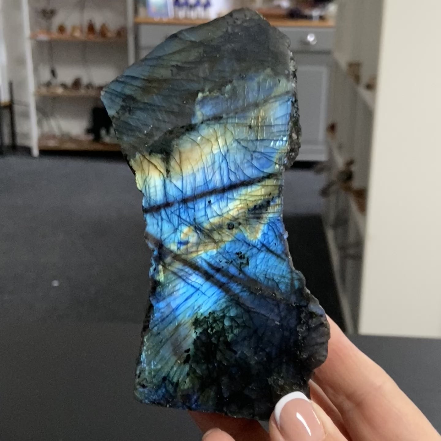 This is a piece to work with consciously. Sit with it. Let your eyes follow the movement of colour. Ask what wants to unfold next and allow the answer to arrive in its own way. Like the butterfly, this Labradorite reminds us that transformation is not rushed, but when it comes, it is unmistakable.