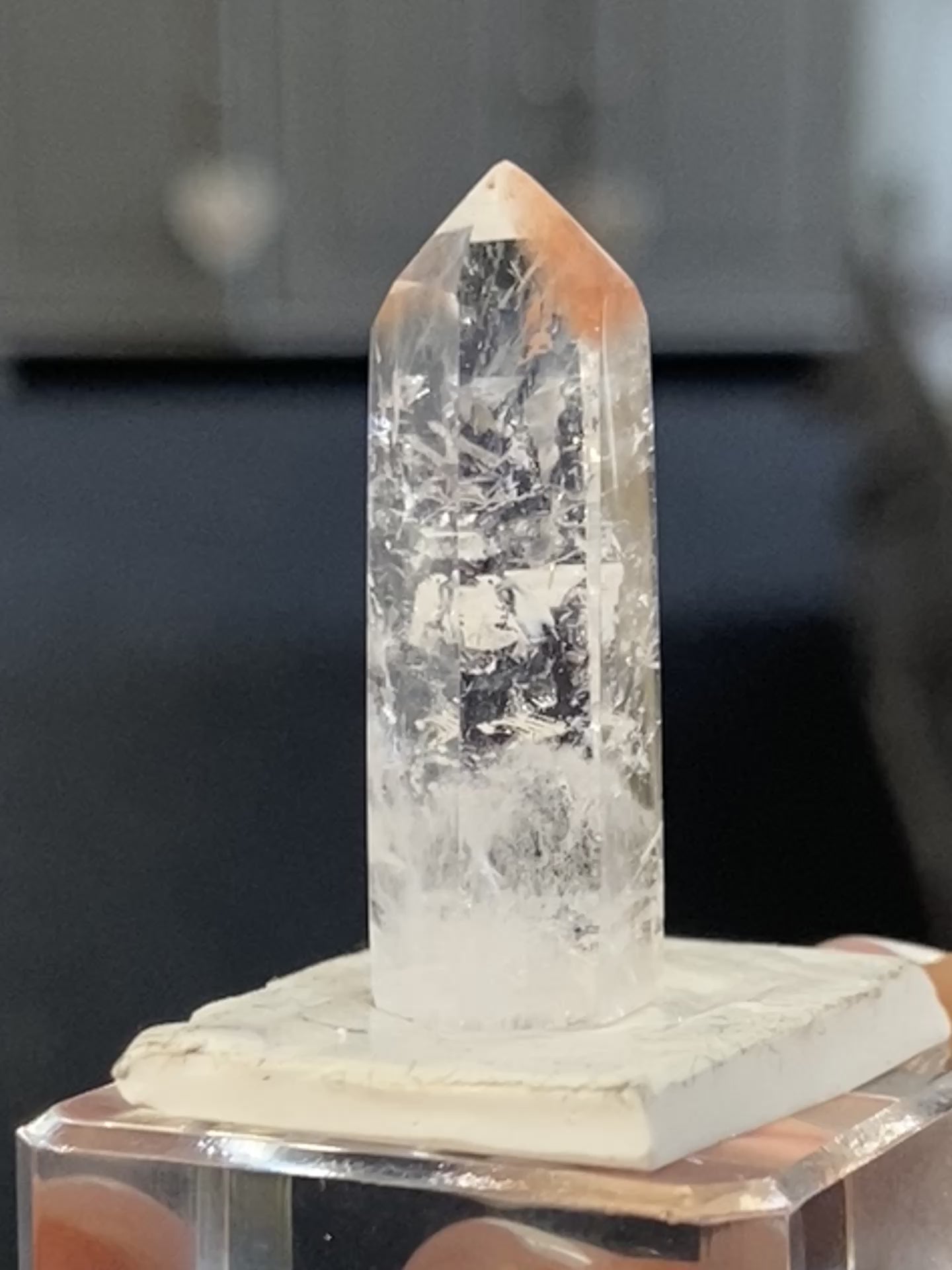 A delicate tower with a soft orange chalcedony inclusion near the tip, rising above white cloud-like wisps within the quartz. These internal layers give it a dreamy, misty effect — perhaps milky quartz, perhaps lodolite, but either way it creates a gentle and ethereal feel. Small, light, and quietly enchanting.