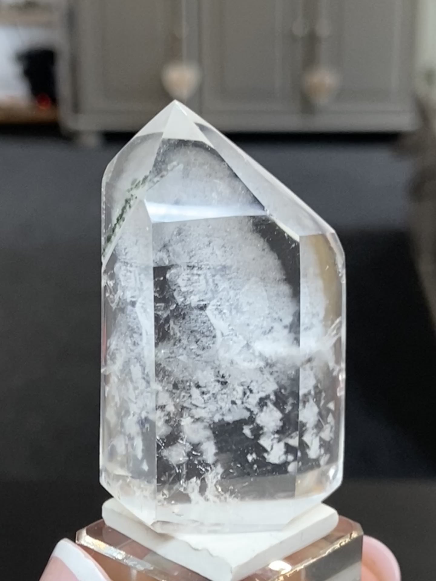 This is a stunning tower, full of depth and dimension. Inside the clear quartz body, layers of chlorite and lodolite create a striking phantom effect — like landscapes captured in stone. As you turn it, the inner shapes shift and reveal themselves, giving the sense of peering into a miniature world.