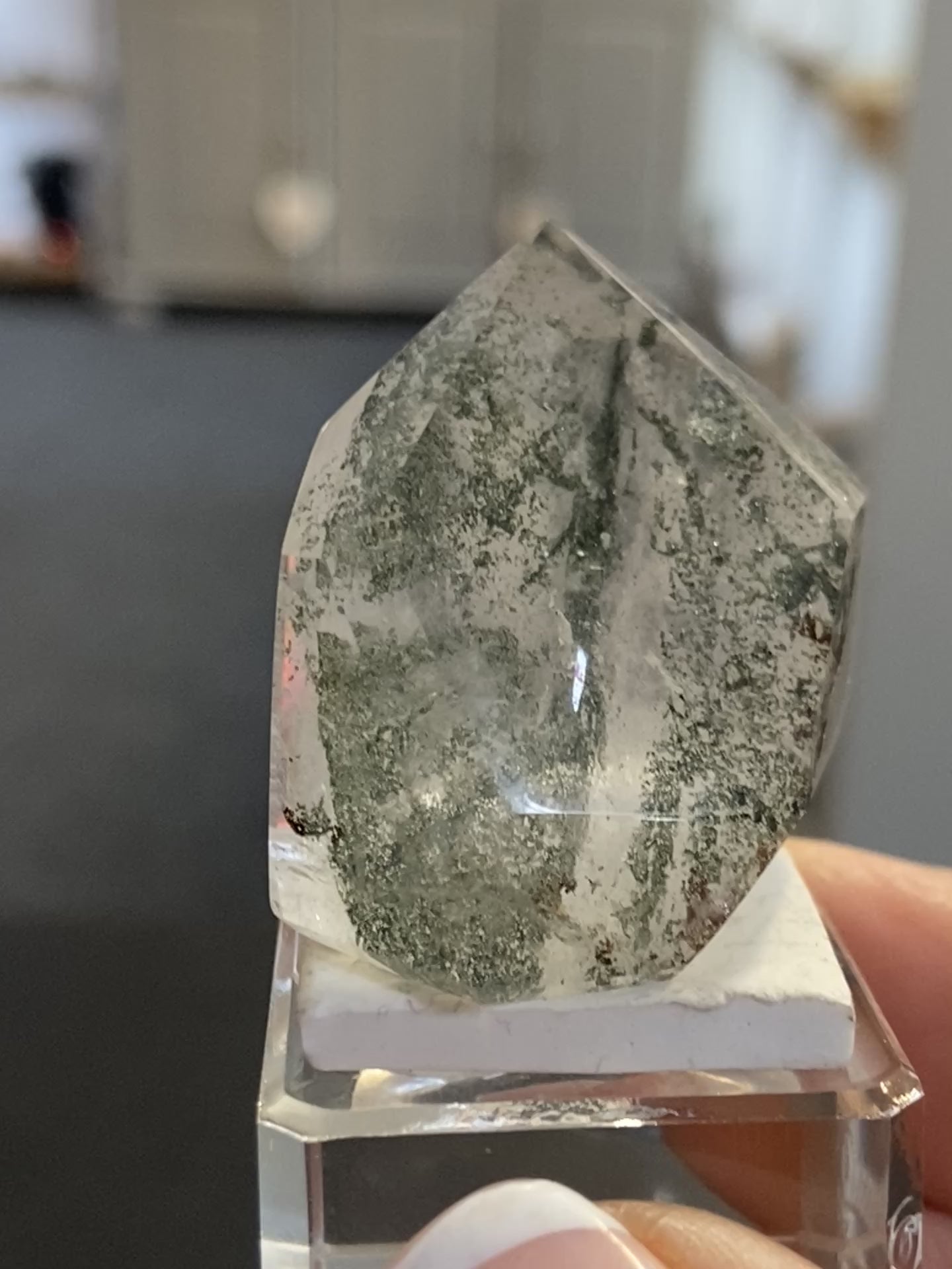A truly enchanting little tower, its quartz body holding soft sweeps of chlorite that cascade down the interior like a misty waterfall. The inclusions flow in layers, giving the illusion of movement. Its compact shape makes it easy to hold and turn, revealing shifting depths from every angle.