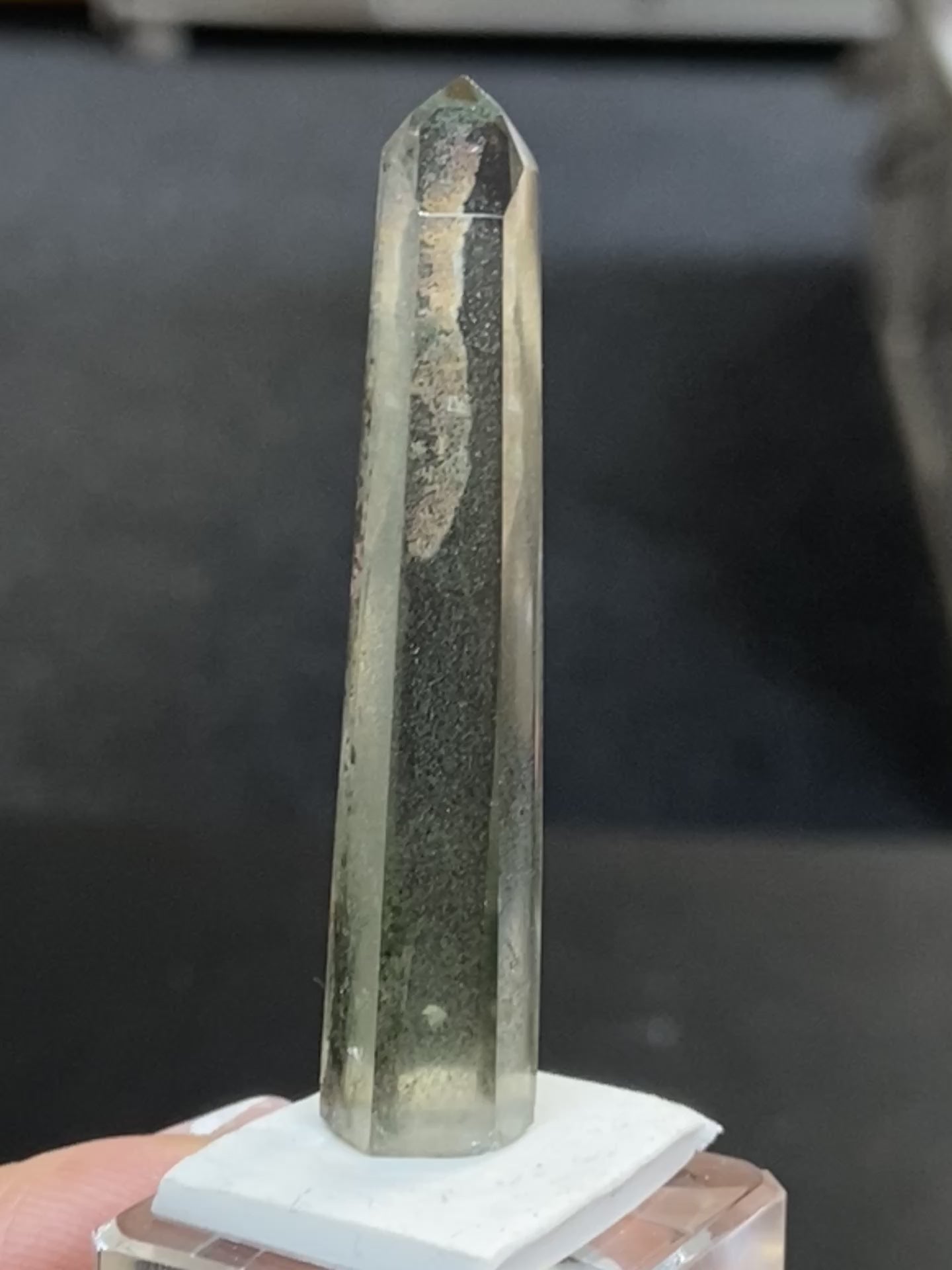 A graceful, slim tower with an earthy heart. This smoky quartz carries chlorite within, soft green tones that shift and layer as you move it in the light. Its elongated shape gives it a refined presence despite its small size, almost wand-like in form.