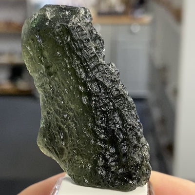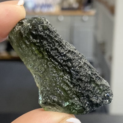This is an outstanding, investment-grade piece of Moldavite from the Czech Republic. Weighing over 21 grams, its size alone makes it a remarkable specimen, especially in today's market. Its deep, olive-forest green colour is rich, and the surface displays the characteristic, deeply etched, and textured 'sculpting' created by its violent formation and travel through the atmosphere. The shape is substantial yet comfortable to hold, making it ideal for deep, energetic work.