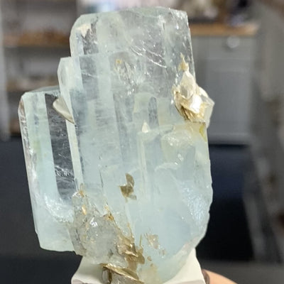 This is an exquisite, natural specimen of Aquamarine from Afghanistan, known for producing some of the finest quality Beryl crystals. Weighing 71 grams, this piece features a cluster of multiple hexagonal barrel crystals growing together, displaying exceptional translucency and a beautiful, pale sky-blue colour. The crystals have sharp, natural terminations and are accentuated by minor, shimmering inclusions of mica matrix attached to the base.