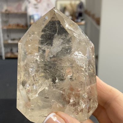 This is a high-grade natural Citrine crystal tower from Brazil, weighing just under half a kilo. It features a beautiful, light honey-golden colour and is richly veined and fracturing, creating strong internal fire and rainbows when the piece is rotated. This tower is highly prized for its natural seven-sided termination, which classifies it as a Channeler Crystal. This specific natural formation, where seven faces meet at the point, makes it a master tool for high-level spiritual work.