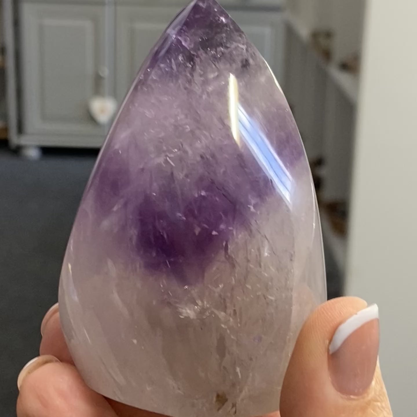 This is a beautiful Phantom Amethyst flame from Brazil, polished into a soft flame shape that really suits the internal movement of the crystal. The phantom growth is clearly visible within the Amethyst, with layers and shifting tones of purple suspended inside clearer Quartz. It gives the piece depth and a real sense of story, almost like you are looking through stages of growth held in time.