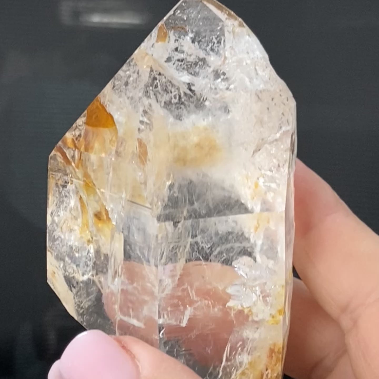 A clear, high-grade Lemurian Quartz with strong structure and presence… and then that internal flash of deep golden fire running through it. There’s even a moment where the light catches and throws a soft blue sheen against the warmth, which just adds another layer to it.