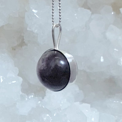 This tactile pendant features a gem-quality Purple Mica sphere, rich in natural lithium and known for its calming, emotionally balancing energy. The Lepidolite has a deep, velvety tone with soft shimmer that catches the light in gentle flashes.