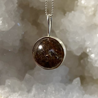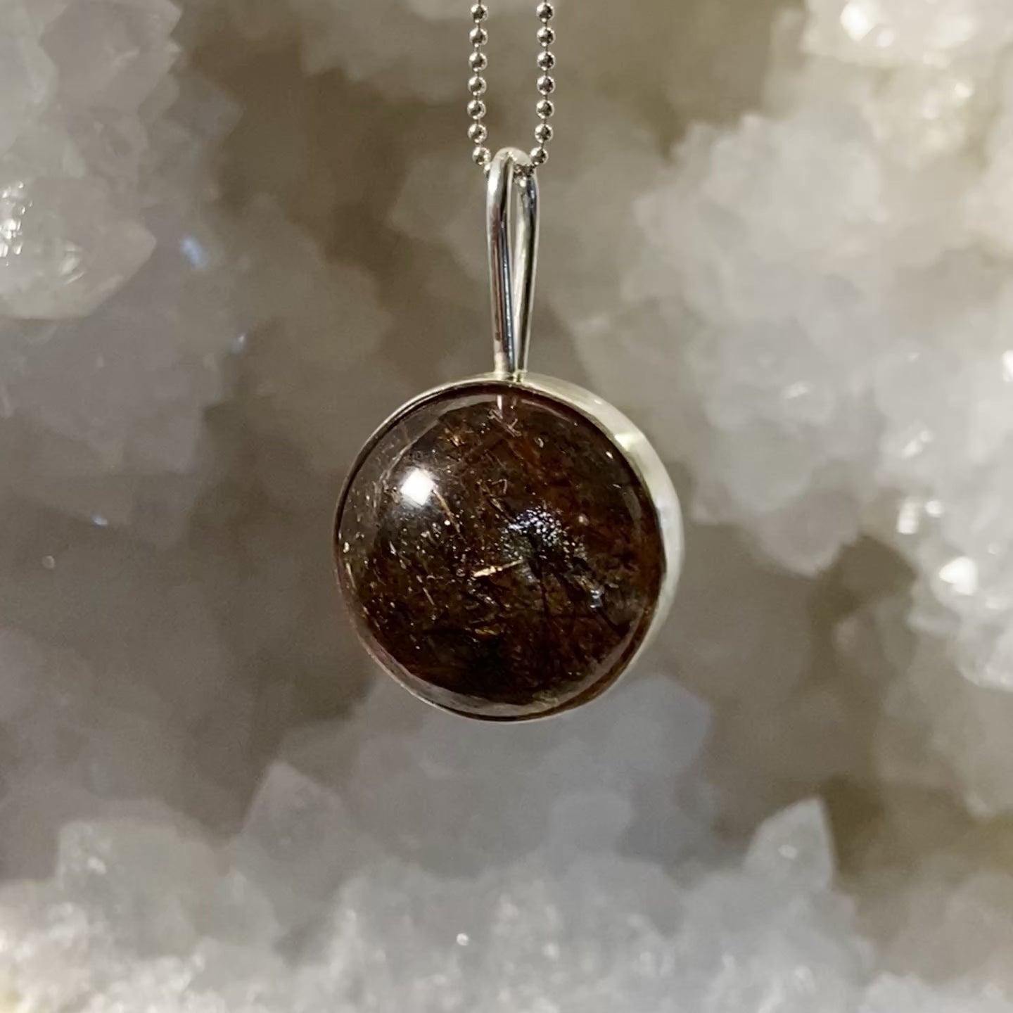 This one is a showstopper. A stunning Quartz sphere thickly threaded through with golden and deep red Rutile needles, captured in a hand-forged sterling silver setting that allows the crystal to spin freely inside its frame. It’s a piece that glows with inner fire, a tiny universe of light, movement, and magic.