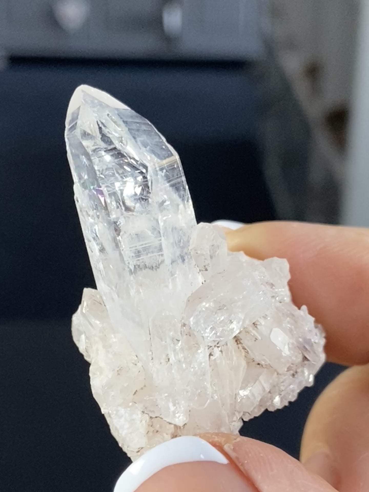 The main point of this piece is clear and finely striated, a classic marker of Lemurian quartz. Striations are often seen as carriers of encoded wisdom, helping to unlock higher remembrance and spiritual connection. Despite its small size, this crystal radiates with clarity and focus, making it a powerful companion for meditation and healing.