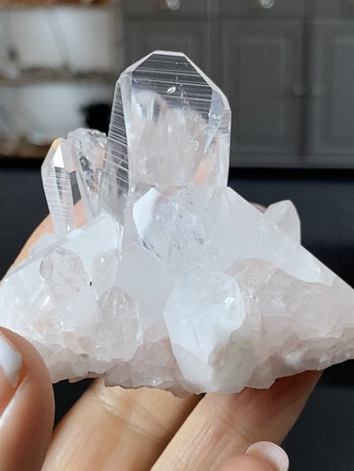 This Sacred Pink Lemurian cluster centres around a magnificent main crystal, clear and beautifully striated, rising proudly from a base of smaller companion points. Delicate pink tones run through the quartz.