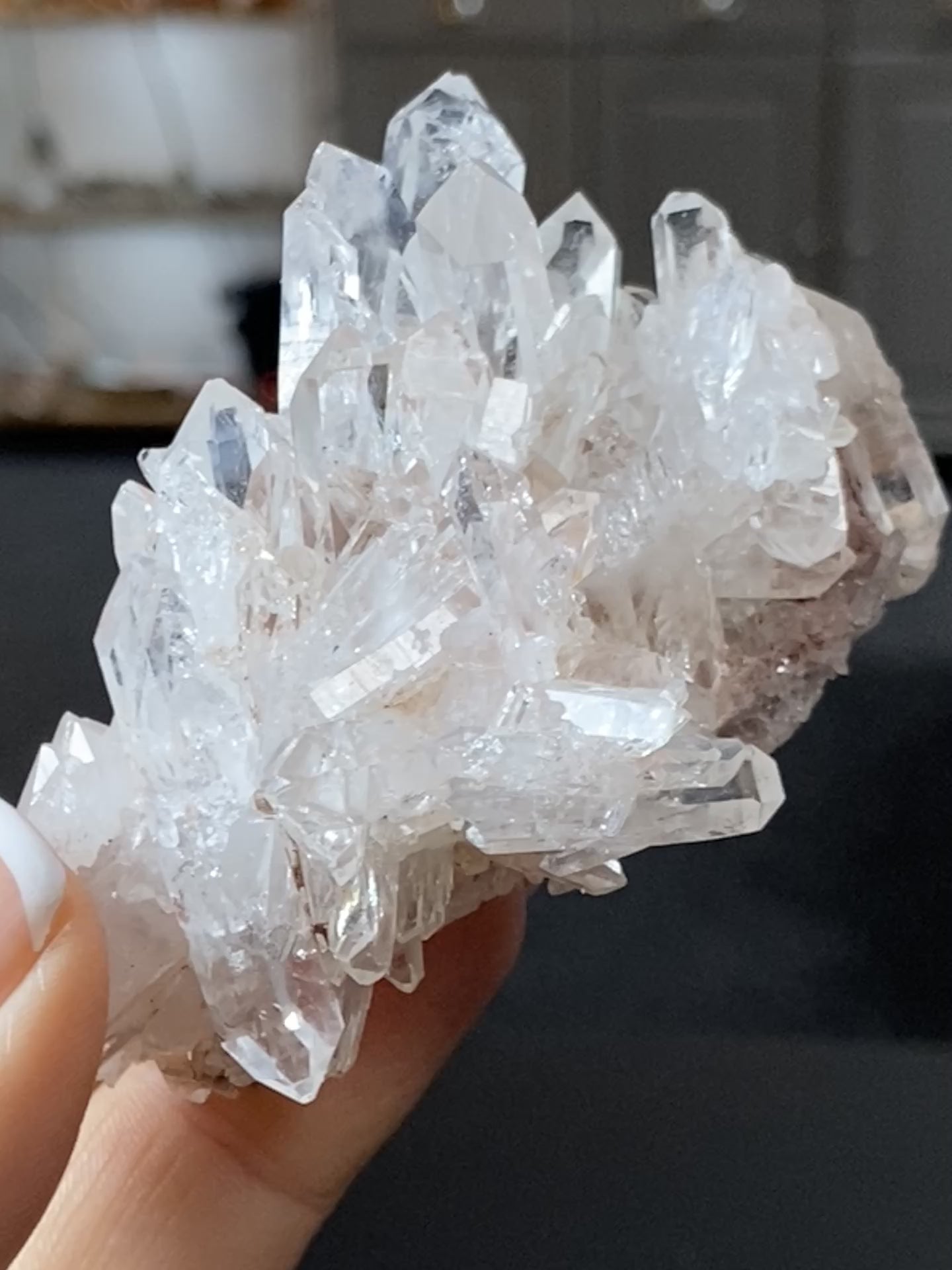 This Sacred Pink Lemurian cluster carries an delicate energy, its pale pink tone glows through crystal-clear Quartz. The clarity is exceptional, each point is sharply defined, reflecting and refracting light like glass.