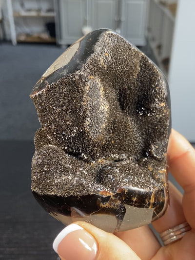 This Madagascan Septarian geode feels like holding a piece of ancient earth magic. Known as the “Dragon Stone,” Septarian is a unique blend of minerals: