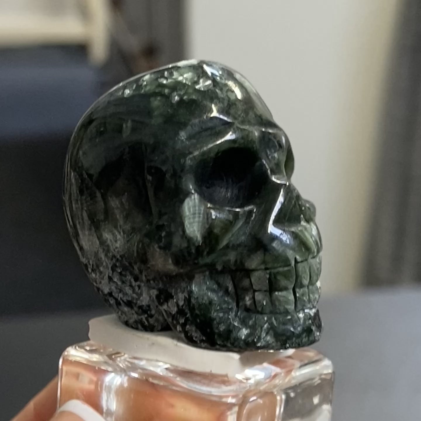 This is a detailed carving of a mini skull made from high-grade Seraphinite. Seraphinite is famous for its deep forest-green colour and unique silvery chatoyancy. In this piece, the fibrous mineral structure creates a beautiful pattern across the skull that looks like feathered wings or light reflecting off silk. It is a highly tactile carving that manages to show off the natural beauty of the stone despite its smaller scale.