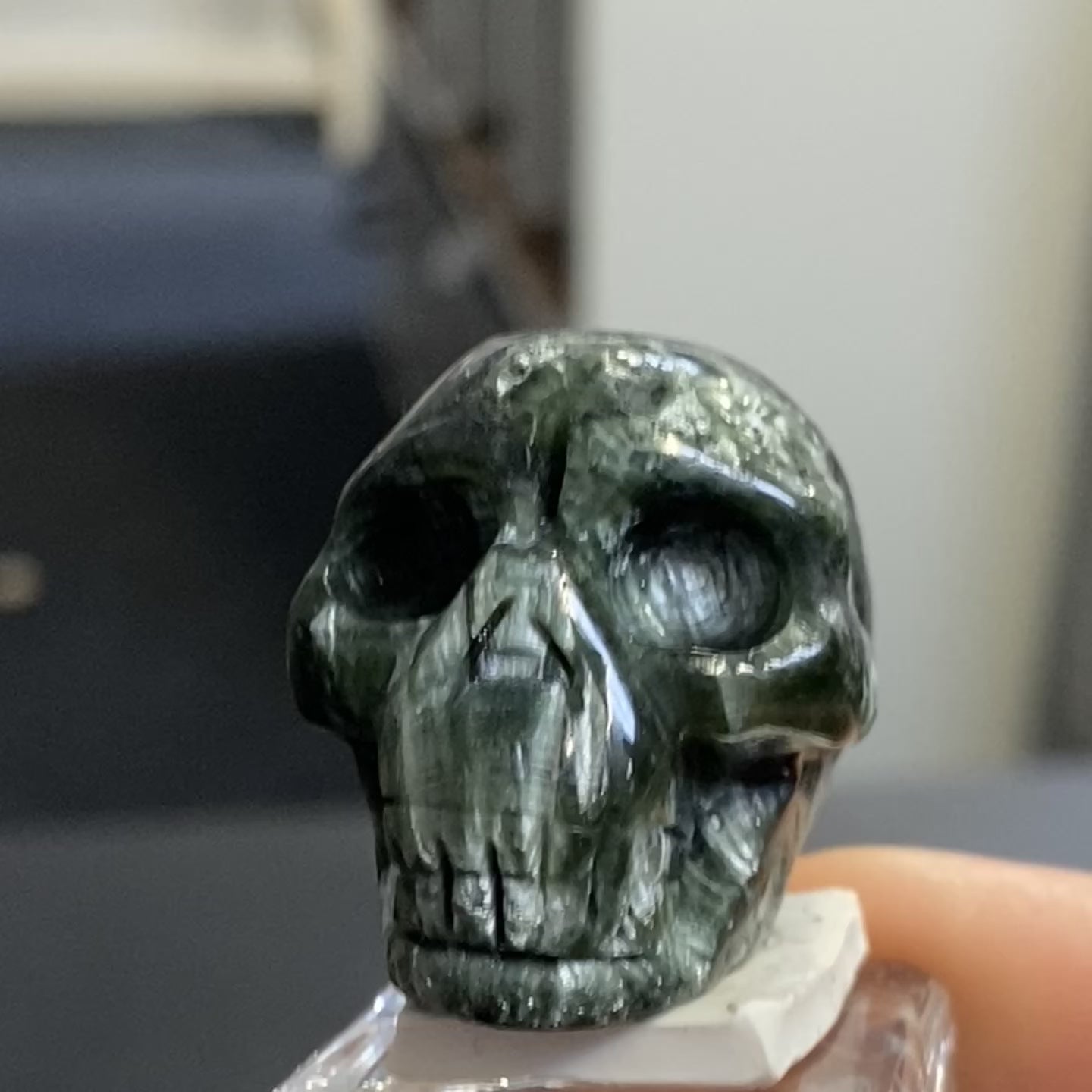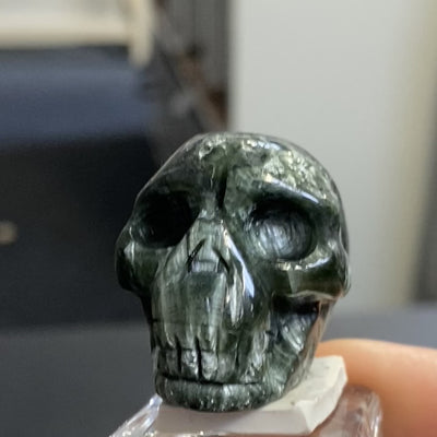 This is a detailed carving of a mini skull made from high-grade Seraphinite. Seraphinite is famous for its deep forest-green colour and unique silvery chatoyancy. In this piece, the fibrous mineral structure creates a beautiful pattern across the skull that looks like feathered wings or light reflecting off silk. It is a highly tactile carving that manages to show off the natural beauty of the stone despite its smaller scale.