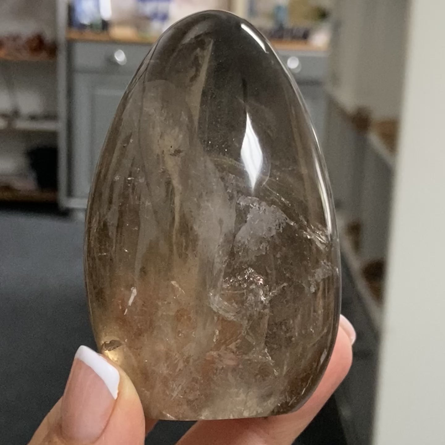 A deep, complex Smoky Quartz freeform from Madagascar, layered internal landscapes and shadowy depth. This darker beauty holds intricate inclusions and flowing mineral patterns that give it a sense of quiet movement.