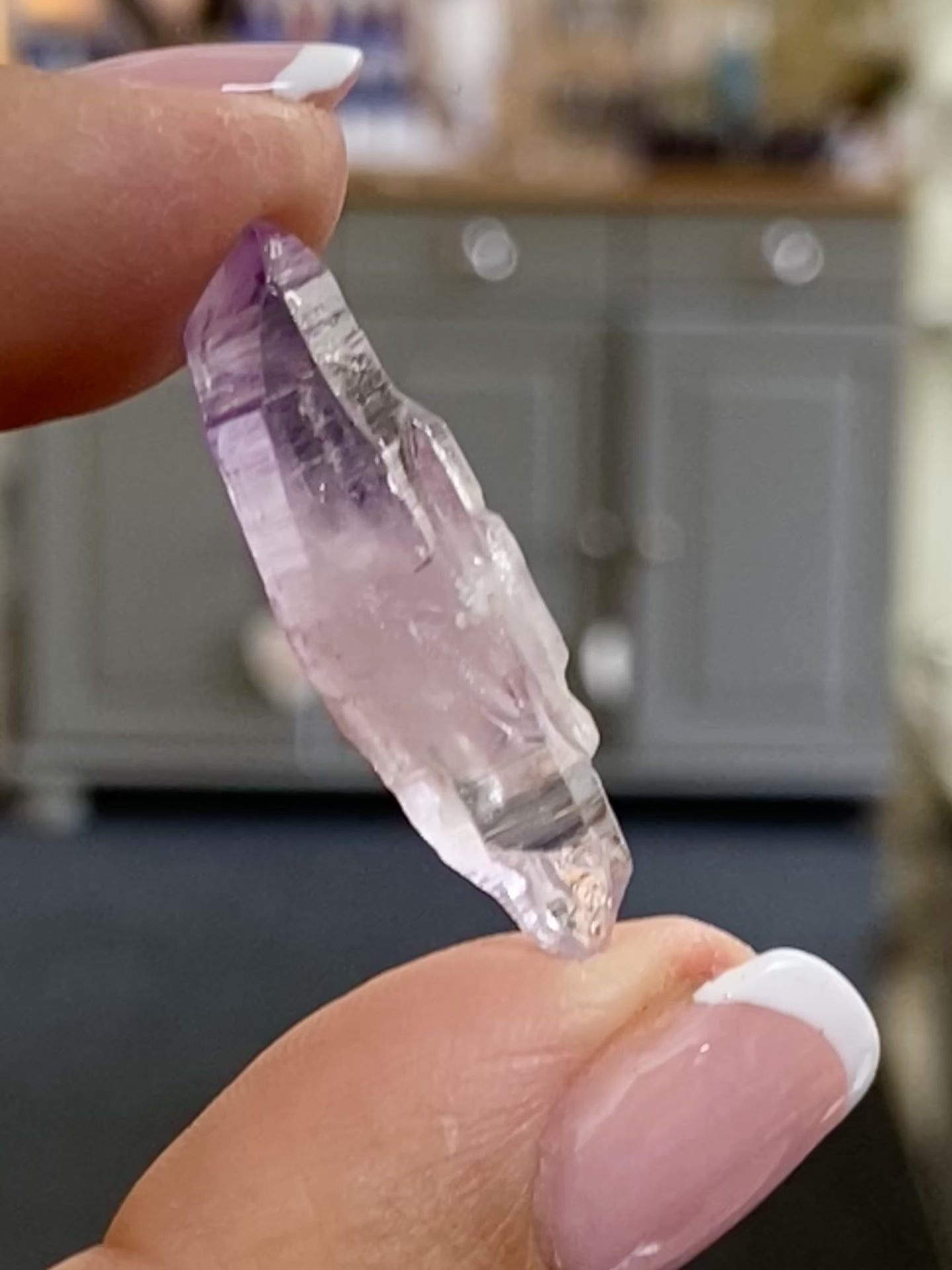 This double-terminated Veracruz Amethyst carries a refined, graceful energy. With its slender form and delicate lilac-to-violet zoning, it almost looks like a wand of liquid light. Both terminations are beautifully formed, allowing energy to move freely through the crystal, making it a wonderful tool for balance, clarity, and flow